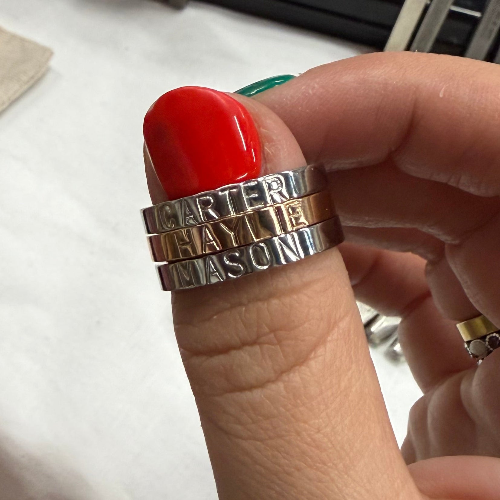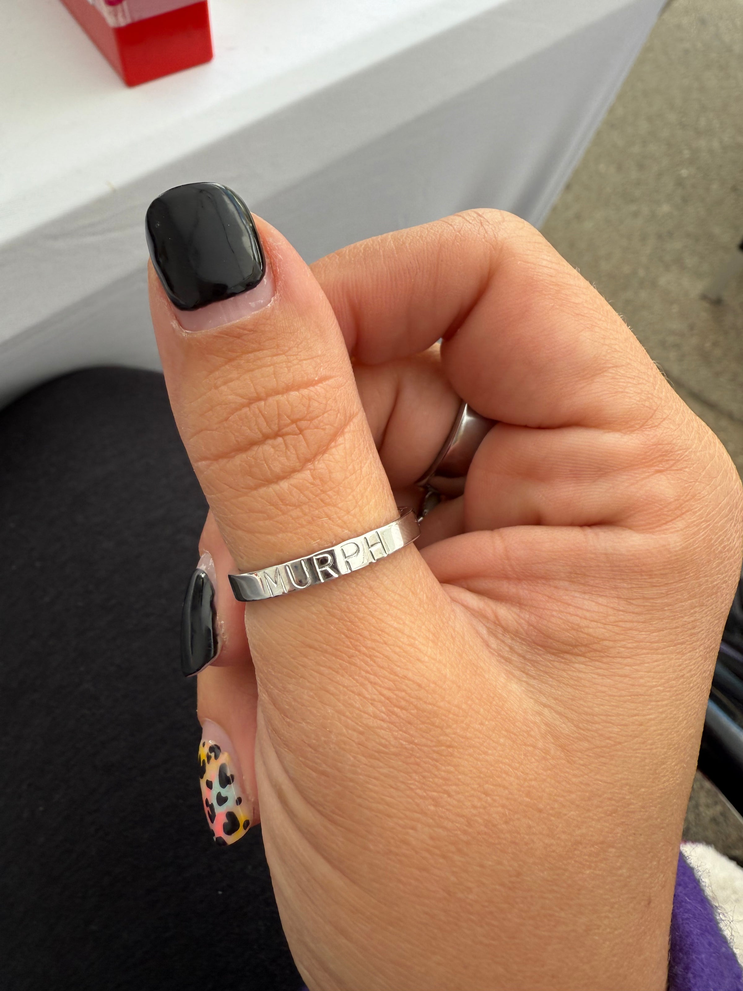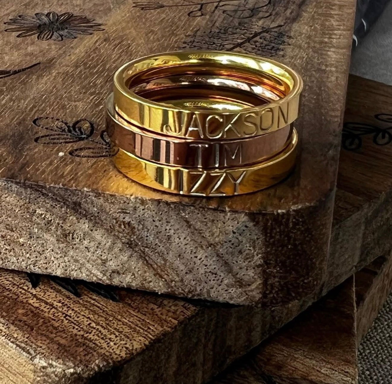 The Signature Keepsake is a 3mm stainless steel band designed to hold what matters most. Each ring is carefully hand stamped with your chosen name, word, or meaningful date — creating a piece that tells your story in the simplest, most timeless way.